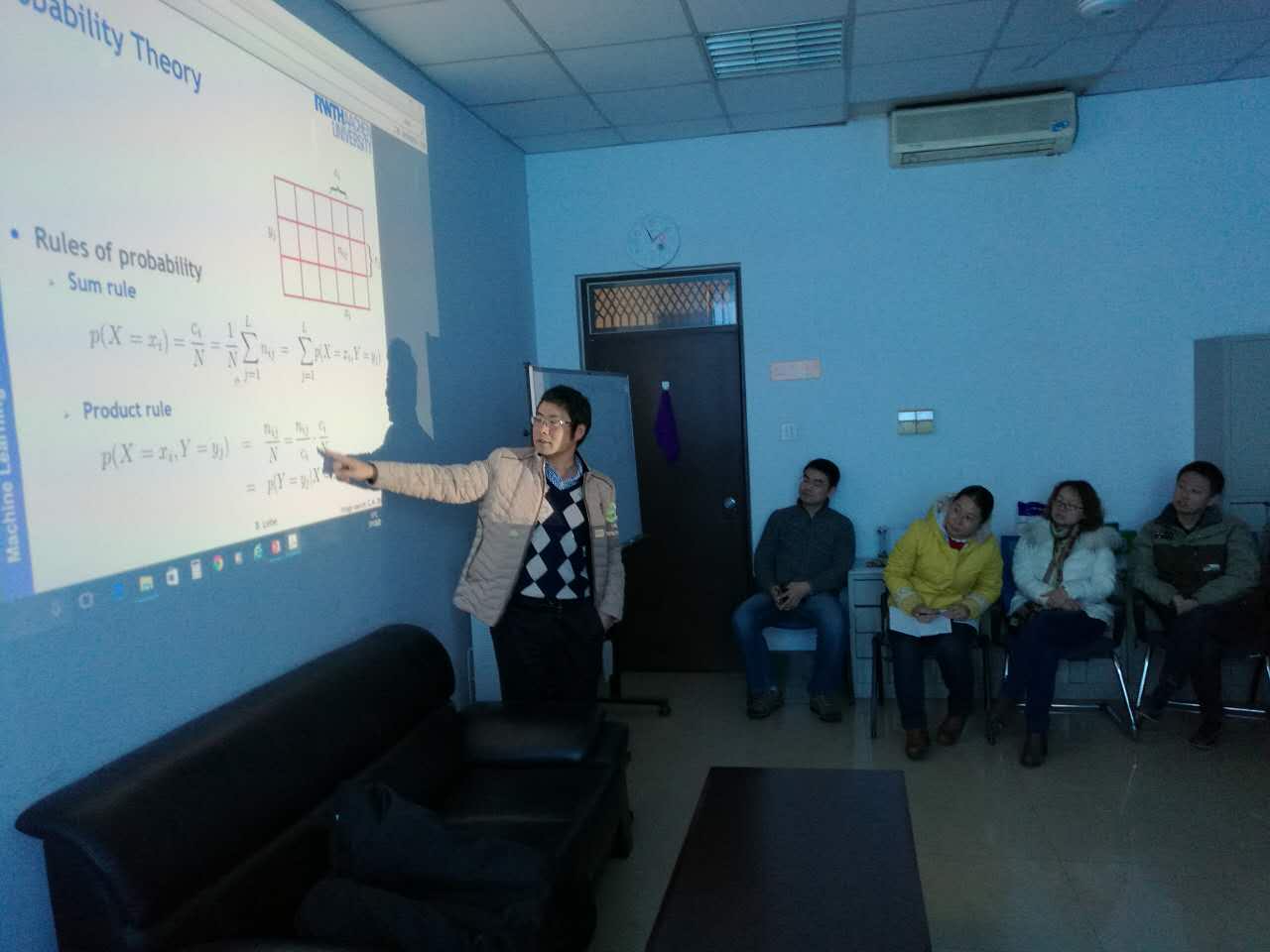 2016年11月25日上午,太阳成集团tyc9728老师们在北区基础实验楼706参加了模式识别和机器学习系列讲座第一讲。这一讲,由杨关博士给大家讲解学科基础知识。杨老师结合具体实例和研究经验给大家着重讲了模型选择中的过拟合,贝叶斯估计、最大似然、最大后验概率的联系,高斯分布中的协方差,正则化优化式中的惩罚项。刘卫光院长根据现场老师专业研究基础参差不齐的情况,穿插给大家详细地举例讲解了分类的概念、机器学习的关键问题、概率论的基础知识、贝叶斯决策论的基本概念。讲座的最后,老师们达成一致,每星期抽出一次时间由杨老师加补一次数学基础。
