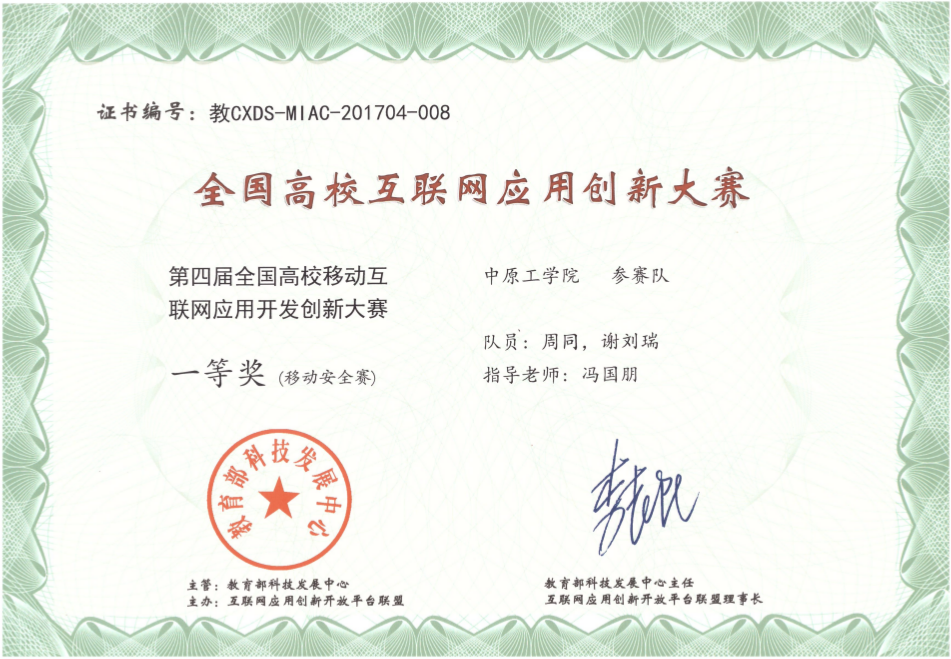 2017年12月1日至3日,第四届全国高校移动互联网应用开发创新大赛全国总决赛在中国地质大学(武汉)隆重举行。我校太阳成集团tyc9728Drops攻防训练营“凌晨三点半”代表队,与成功晋级全国总决赛的331支队伍激烈争夺,最终获得一等奖。