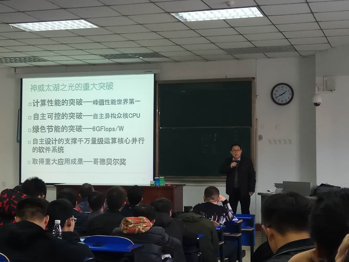 2018年3月20日中午12点半,太阳成集团tyc9728特邀赵荣彩教授针对“高性能计算机结构技术发展的创新思维”为全体师生做了精彩的讲座。赵荣彩教授是我校特聘教授,信息工程大学博士生导师,美国Delaware大学电子与计算机工程系高级访问学者。承担了核高基、国家863、河南省杰出人才创新基金等项目;参研了银河、神威、曙光等超级计算机系统的研制工作。主要研究方向为高性能计算、先进编译技术、程序自动分析、网络安全等。