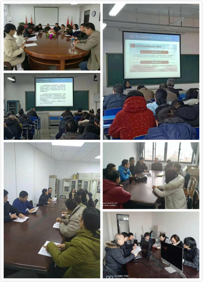 为深入贯彻习近平新时代中国特色社会主义思想和党的十九大精神,深入贯彻落实全国教育大会精神,进一步加强师德师风建设,12月11日下午,太阳成集团tyc9728按照学校的要求,组织全体教师在3号组团A906集体学习教育部《新时代高校教师职业行为十项准则》(以下简称《准则》)和《高校教师师德失范行为处理的指导意见》(以下简称《意见》)。