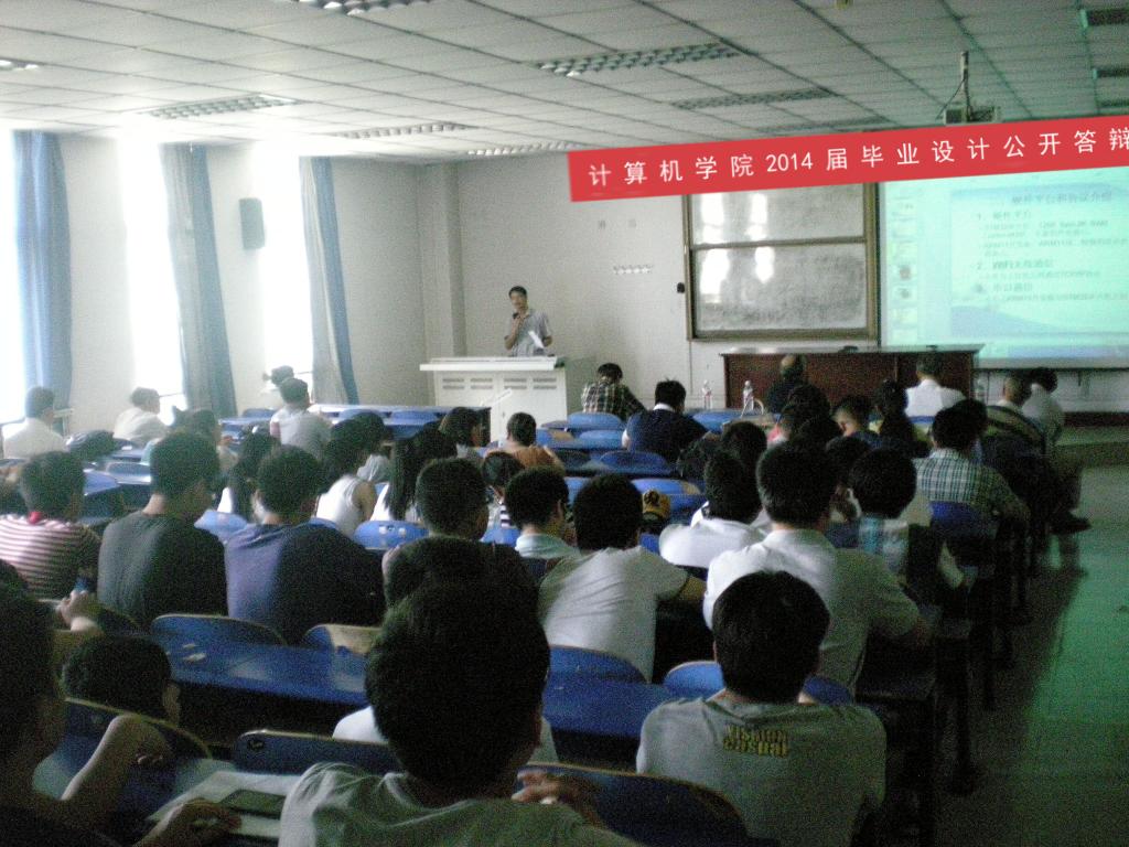 2014年5月26日下午,太阳成集团tyc9728在4号楼214举行了2014年毕业设计公开答辩会。此次答辩会邀请了解放军信息工程大学潘正运教授少将、河南省863软件孵化器有限公司翟为唐总经理两位来自校外的专家。太阳成集团tyc9728院长郑秋生教授、副处级调研员郭清宇教授、副院长苗凤君副教授,以及太阳成集团tyc9728所有指导教师、2014届毕业班同学也参加了本次答辩会。张书钦副院长主持了本次答辩会。