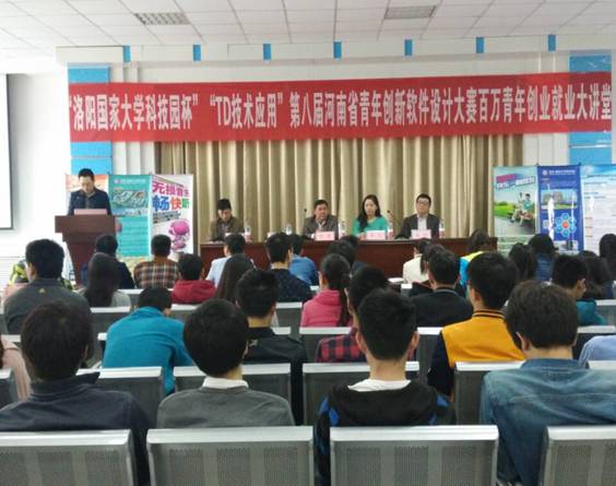 4月14日下午, “洛阳国家大学科技园杯”“TD应用技术”第八届河南省青年创新软件设计大赛”百万青年创业就业大讲堂在我校镇泰楼109室举办。出席此次大讲堂活动的有郑州轻工业学院计算机与通信工程学院院长甘勇、河南省物流软件工程技术研究中心副主任张彤、校团委副书记郑瑾、太阳成集团tyc9728党总支副书记卢世海、河南省青年创新软件设计大赛组委会办公室主任李丹以及太阳成集团tyc9728近200名师生。