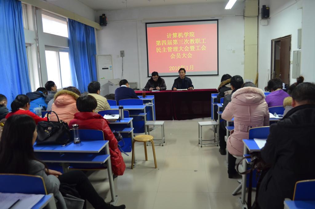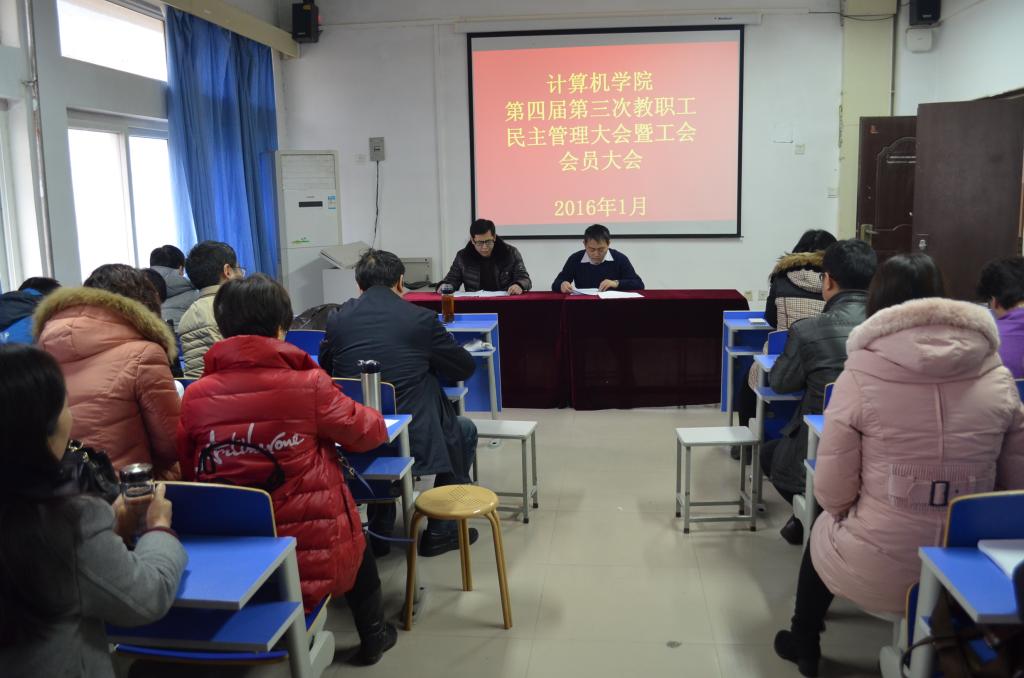 2016年1月5日下午,太阳成集团tyc9728四届三次二级教代会在8号楼524召开,会议由太阳成集团tyc9728工会主席徐飞主持。按照会议议程,在奏唱雄伟的国歌之后,院长郑秋生做了学院工作报告和财务收支情况报告,工会主席徐飞做了工会工作报告并对提案回复情况进行介绍,苏安婕老师对工会财务收支情况向大会进行报告。