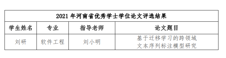 近日,河南省教育厅、河南省学位委员会下发了《关于批准2021年河南省优秀学位论文的决定》(教研〔2022〕295 号)文件,我院教师刘小明指导的《基于迁移学习的跨领域文本序列标注模型研究》被评为河南省优秀学士学位论文。