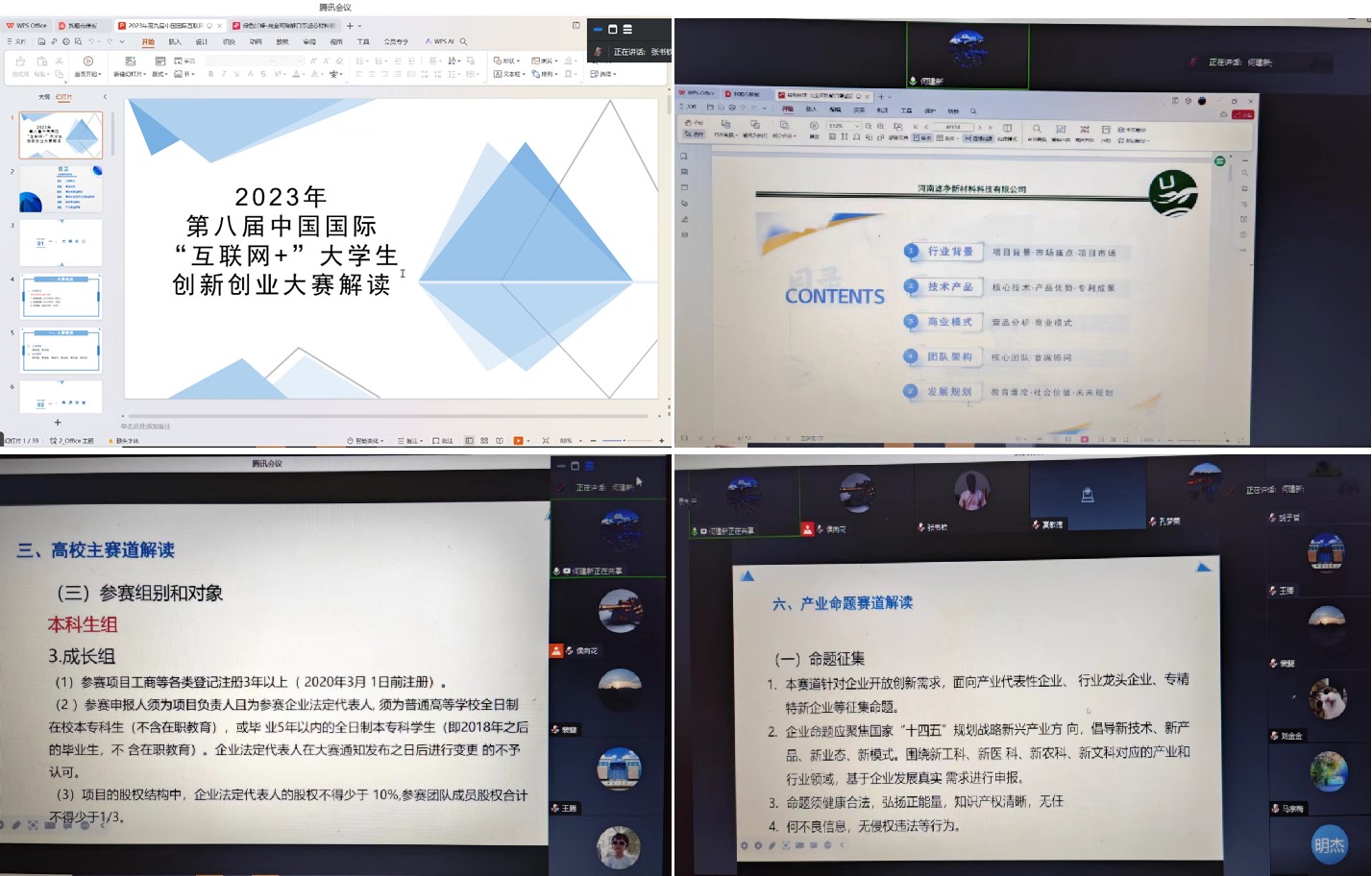 为切实推进我院“互联网+”“挑战杯”等大学生创新创业赛事工作高质量开展,提升学院师生创新创业大赛参赛能力和水平。2024年2月5日晚,太阳成集团tyc9728邀请了 “互联网+”“挑战杯”等大赛国赛获奖项目优秀指导老师——我校纺织服装产业研究院何建新教授进行创新创业赛事线上辅导讲座,我院六十多名老师参加了报告会。