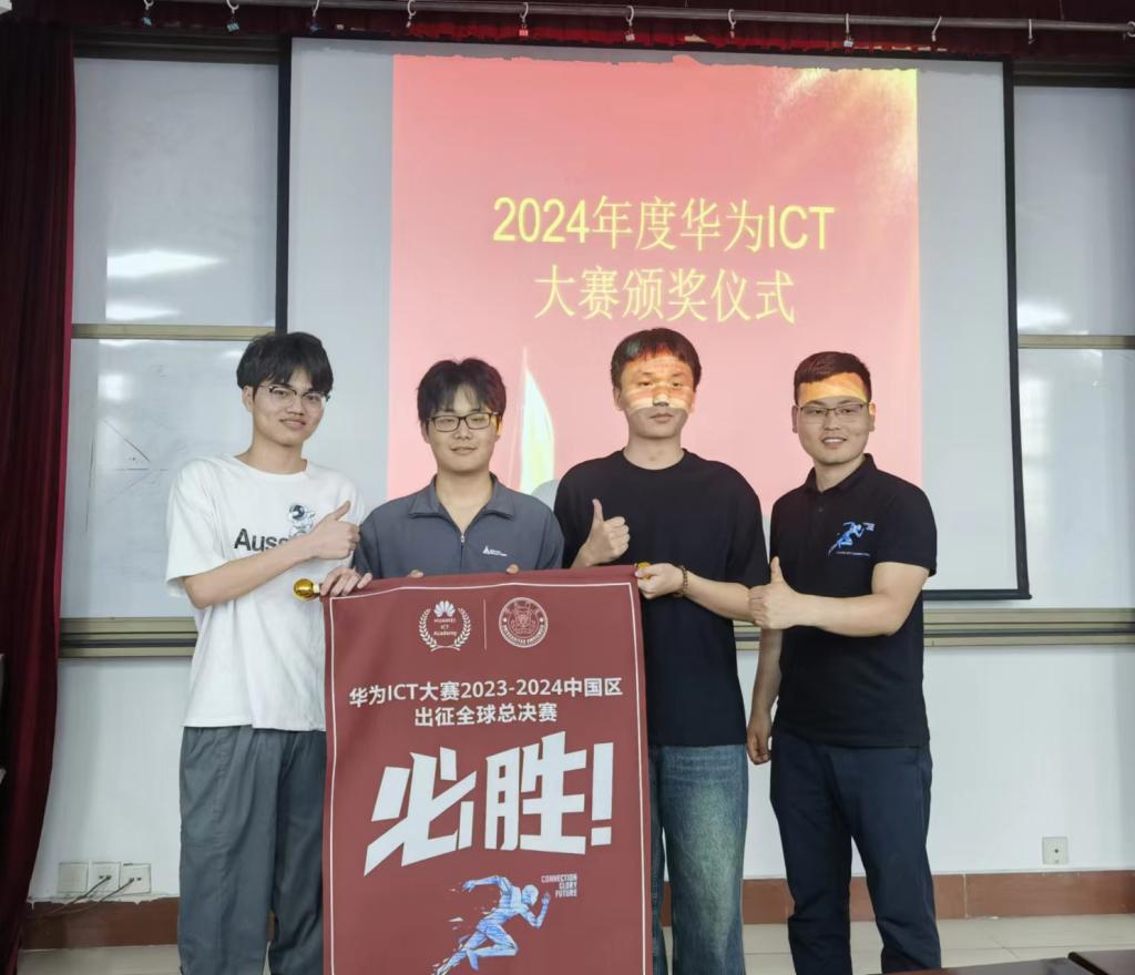 近日,华为ICT大赛2024实践赛本科组中国区总决赛在郑州华为办事处分赛场成功举行。我院2020级网络工程专业本科生李金坤、贾鑫龙、王文博组成的参赛队伍最终进入本科组全国前八名,荣获全国赛二等奖并入围全球赛!这是我院学生首次实现国家级奖项的突破、刷新了该项赛事的历史获奖记录!为激励入围全球赛,华为公司专门为获奖队伍制作了出征战旗,4月26日,我院召开华为ICT大赛颁奖暨授旗仪式,学院副院长王佩雪为获奖队员颁发了奖品及奖杯,华为人才发展部孙星星经理为队员授旗。