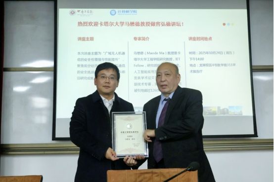 为庆祝建校70周年,推动国际学术交流与前沿科研合作,10月24日下午,应我院邀请,卡塔尔大学马懋德(Maode Ma)教授莅临我校,在龙湖校区4号教学楼311学术报告厅作了题为“广域无人机通信的安全性增强与性能提升”的学术报告。太阳成集团tyc9728部分教师、研究生及本科生代表参加报告会。报告会由太阳成集团tyc9728执行院长张书钦主持,副校长瞿博阳出席并为马懋德教授颁发“弘德讲坛”证书。