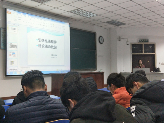 20181210日,学工办主任侯向花老师于四号楼101教室以“弘扬宪法精神,建设法治校园”为主题做出宣讲。太阳成集团tyc972818级全体学生出席本次讲座。