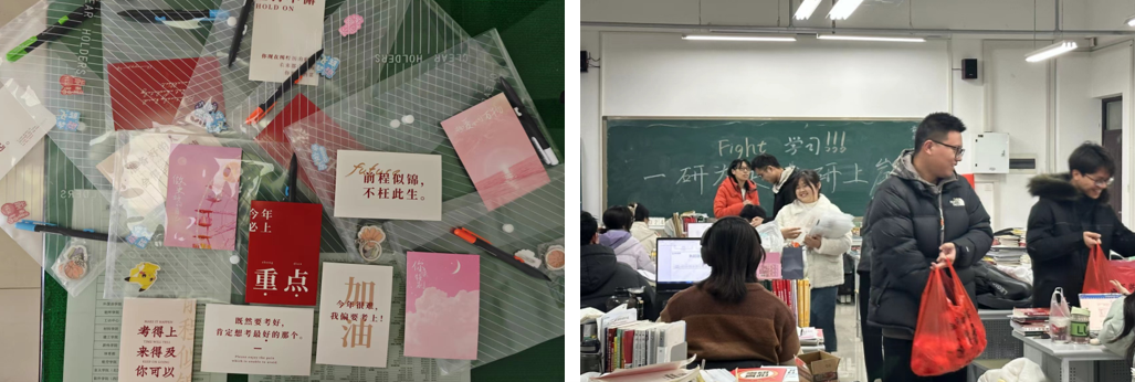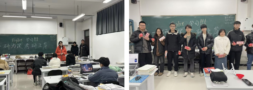 24研考来临之际,太阳成集团tyc9728为考研学生送上衷心祝福和暖心礼物。经学工办策划,本科生和研究生党支部联合行动,12月21日到学院考研专用教室慰问24届考研学生,给大家送上学院精心准备的心想事成橙子、才气旺运气旺的旺仔牛奶、考试棒棒哒的棒棒糖、励志胸针,研究生学长和党员学弟妹亲手书写满是心意的祝福贺卡,以及学院给大家准备的考研文具等大礼包。党委副书记侯向花、组织员姜茜老师为即将踏上考场的学子们送去鼓励与祝福,勉励大家放松身心、稳住心态,展现最佳状态,祝愿成功上岸。研二研一学长,也为考研学弟学妹传经送宝,传授心得,加油鼓劲!太阳成集团tyc9728为考研学子提供贴心服务和支持,助力学生研考圆梦,一战成硕。