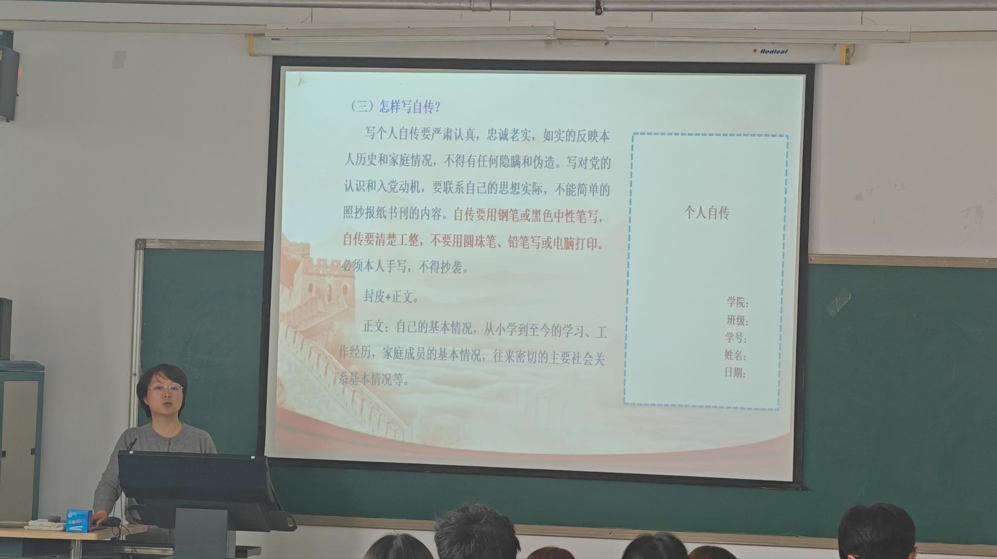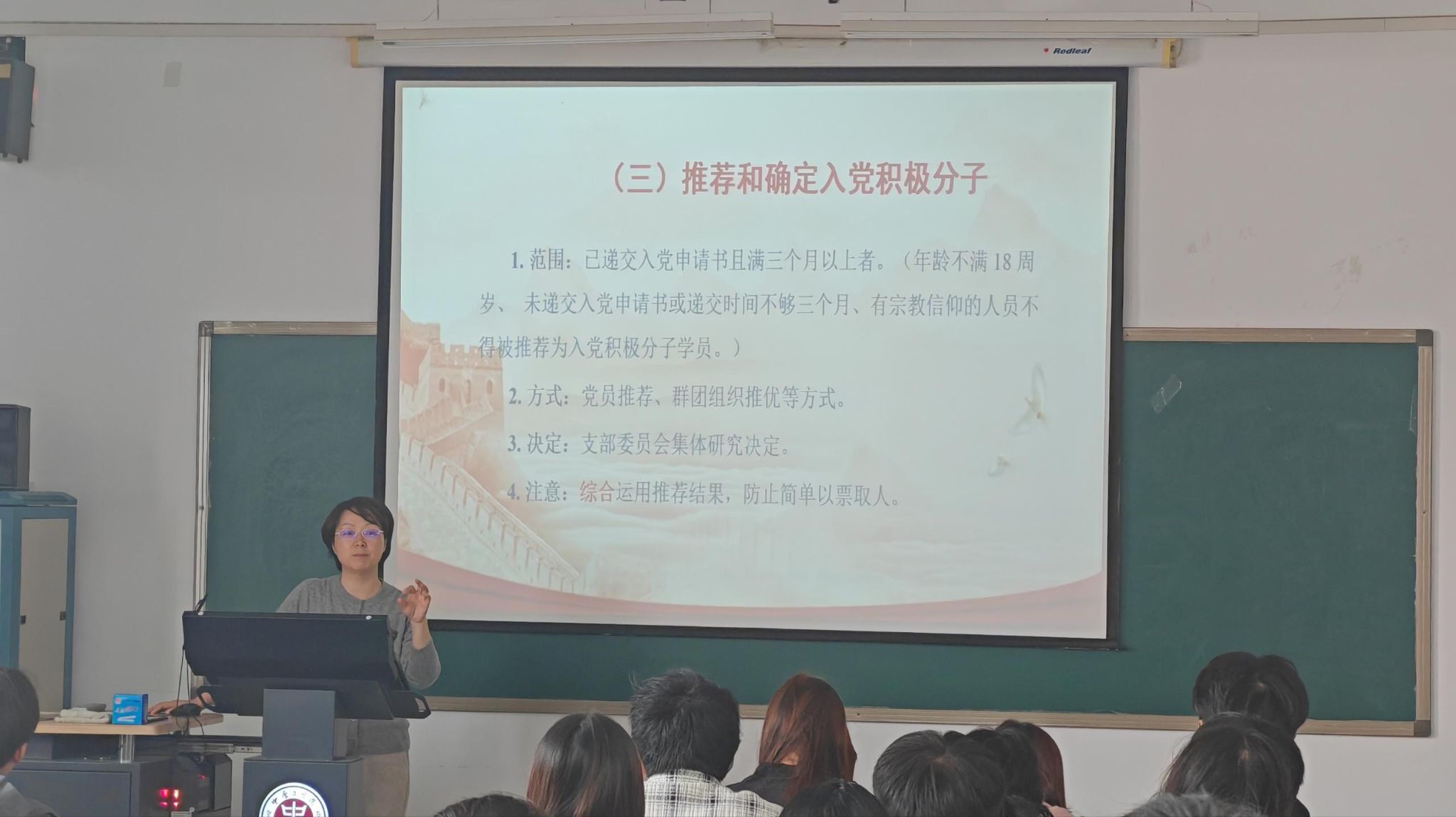 随后,姜老师结合太阳成集团tyc9728学子特点,特别强调三点要求:一是要强化程序意识,严格遵守每一步流程规范,确保材料齐全、手续完备;二是要立足专业特色,将党性修养融入专业学习与科研实践,以技术报国的担当践行入党初心;三是要注重日常积累,认真撰写思想汇报,主动接受党组织考察,做到言行一致、表里如一。